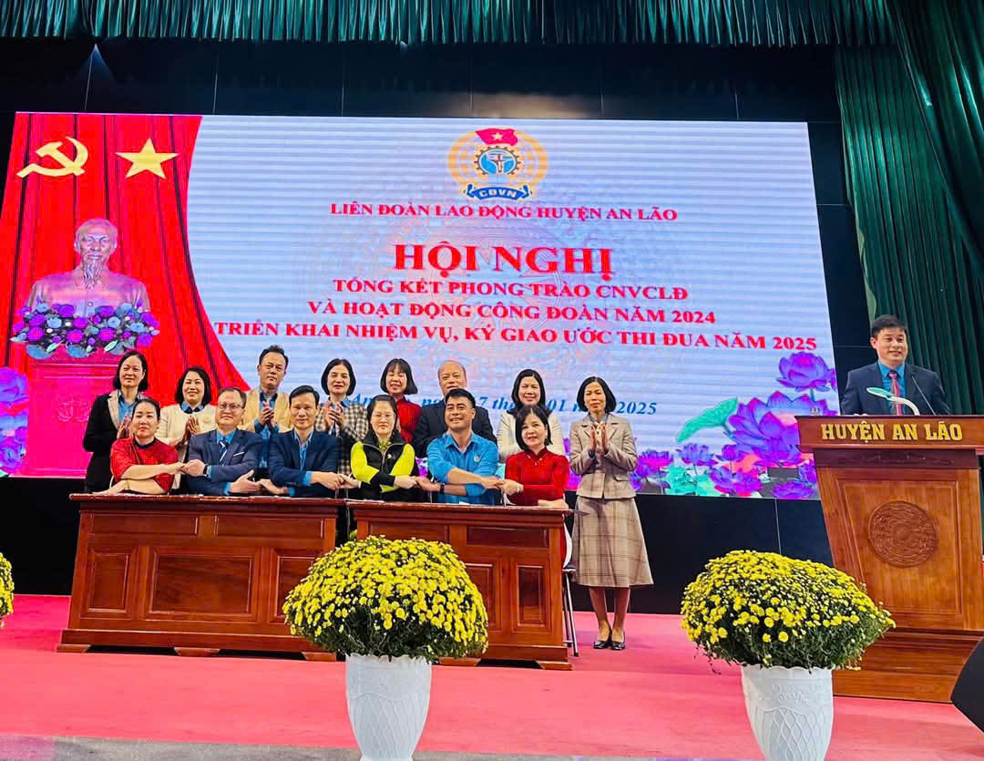 Chiều ngày 17/ -1/ 2025, LĐLĐ An Lão tổ chức tổ chức hội nghị Tổng kết công tác Công đoàn và phong trào CNVCLĐ năm 2024, triển khai công tác công đoàn và phong trào CNVCLĐ năm 2025 thành công tốt đẹp. Đến dự hội nghị đầu năm 2025, có các đại biểu đại diện thường trực LĐLĐ và các Ban của LĐLĐ thành phố; đại diện thường trực huyện ủy, HĐND, UBND huyện và thường trực LĐLĐ An Lão, các đồng chí Chủ tịch các công đoàn cơ sở trong toàn huyện về dự. Các công đoàn xuất sắc và các cá nhân tiêu biểu trong công tác năm 2024 được nhận phần thưởng xứng đáng. Các dại biểu chứng kiến lễ ký kết giao ước thi đua giữa các đại biểu đại diện Công đoàn các khối trong LĐLĐ huyện thực hiện trước sự quan tâm, chứng kiến của các đại biểu về dự hội nghị. Đồng chí Phạm Thị Nga, Chủ tịch LĐLĐ huyện An Lão tổng kết hội nghị, nêu cao quyết tâm thực hiện các nhiệm vụ chính trị trọng tâm công tác Công đoàn và phong trào CNVCLĐ năm 2025 một cách xuất sắc thiết thực chào mừng năm 2025 hội tụ nhiều ngày lễ kỉ niệm lịch sử của Đảng, đất nước và dân tộc.