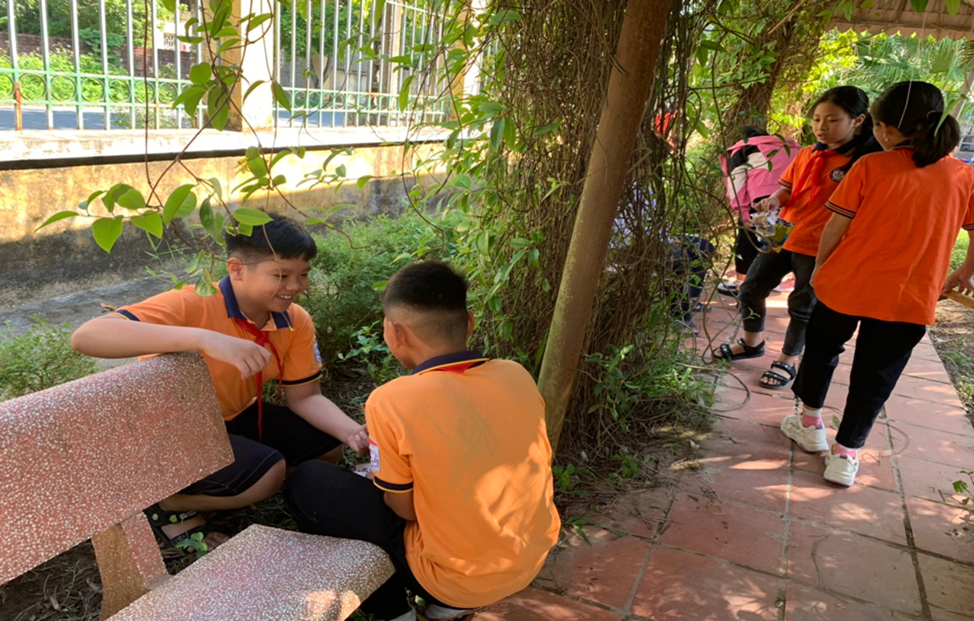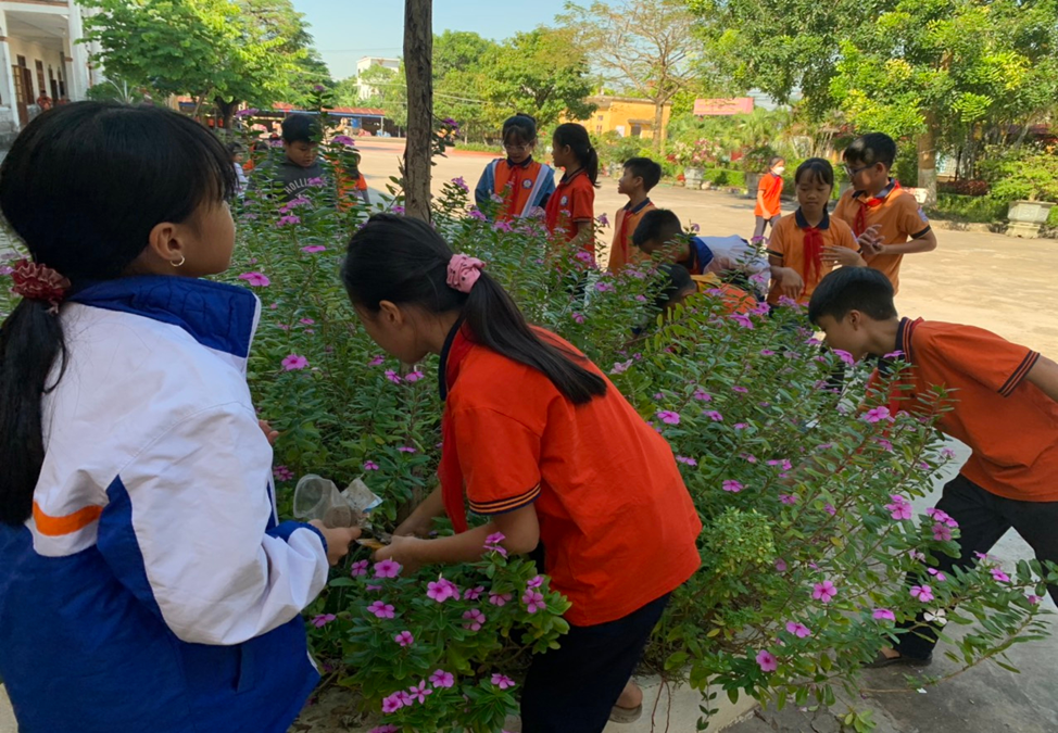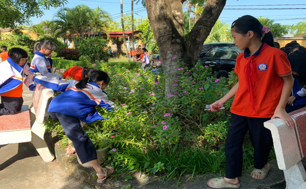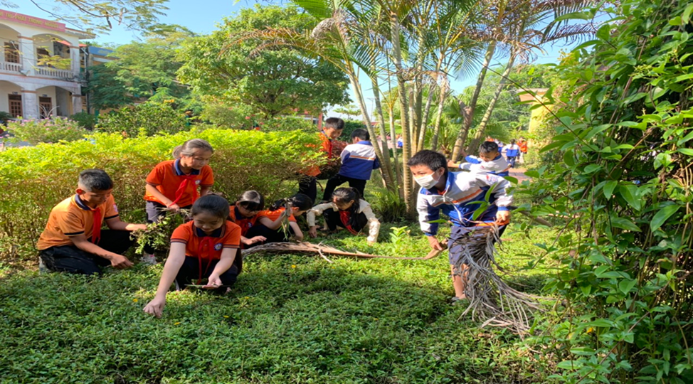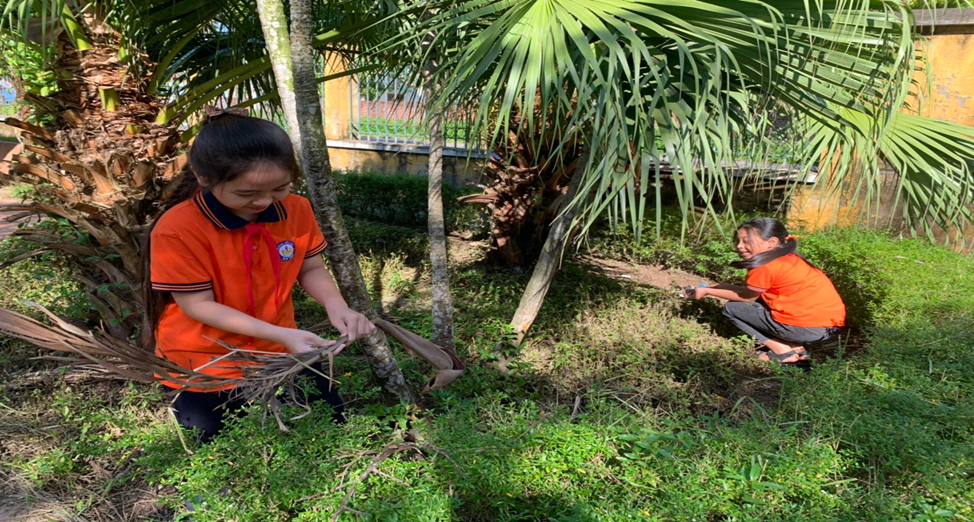 phụ trách, tất cả các em tỏa ra nhặt rác xung quanh trường và nhặt cỏ tại vườn