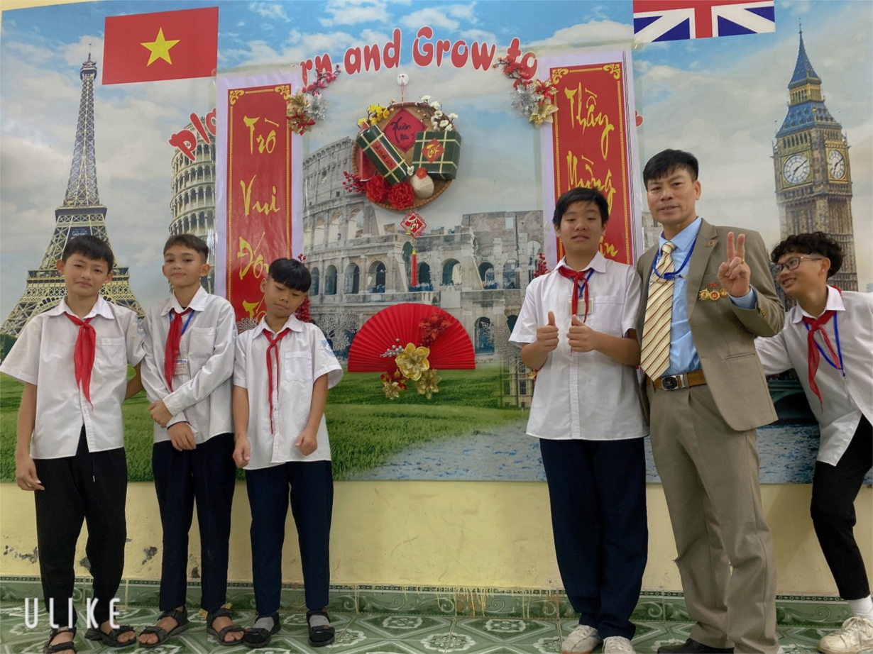 Trong ảnh, thầy giáo chủ nhiệm Nguyễn Văn Tha và các em Huy Hoàng, Xuân Toàn, Trọng Long, Anh Dũng và Trọng Hoàng chụp ảnh lưu niệm.