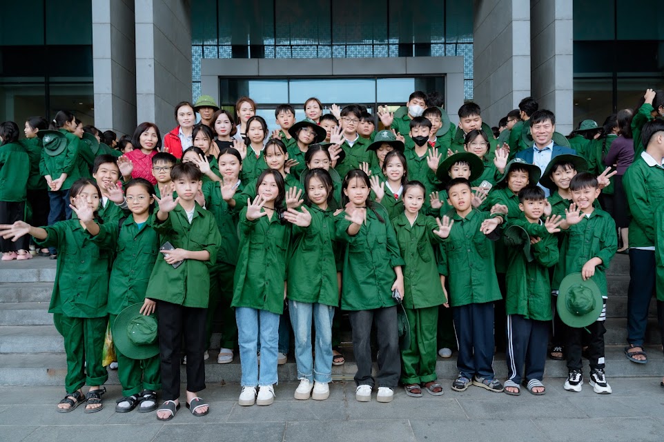 Học sinh lớp 7A trước cửa bảo tàng Hà Nội trong màu áo xanh huyền thoại.