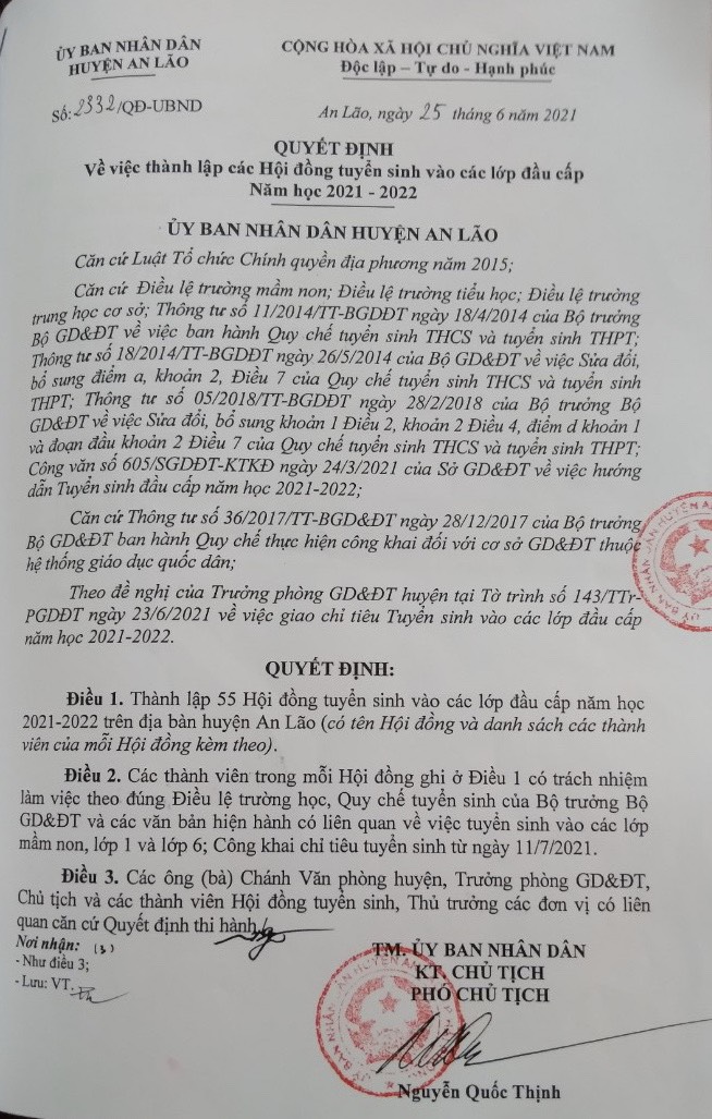 Căn cứ QĐ số 2331/QĐ-UBND ngày 25/6/2021 của UBND huyện An Lão về việc giao chỉ tiêu tuyển sinh