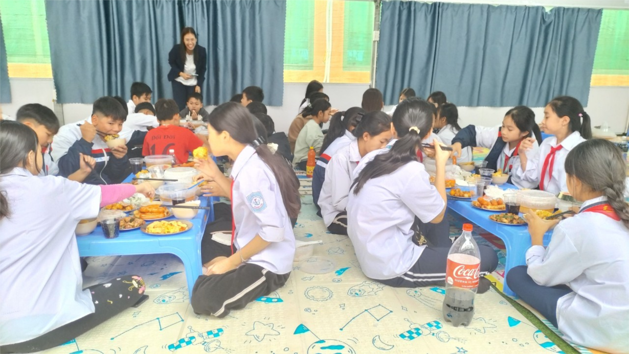 Trong ảnh: các em HS lớp 6C cùng nhau ăn cơm trưa, có một phụ huynh đại diện đi cùng quán xuyến xem xét thực đơn của các con